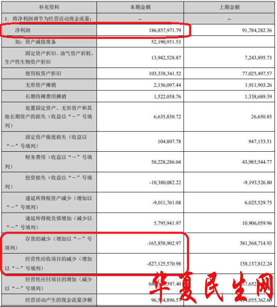 烟台双塔食品股份有限公司(双塔食品 002481.SZ)2019年年报显示,将净利润调节为经营活动现金流量时,净利润为1.87亿元,其中,存货增加1.66亿元,经营性应收项目增加8.27亿元。