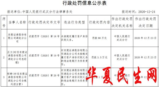 东莞证券湖北违法遭罚80万 未按规定识别客户身份