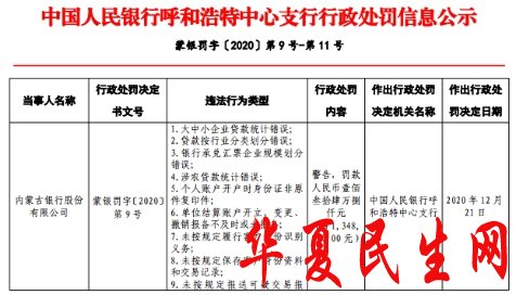 2020年12月21日,中国人民银行呼和浩特中心支行对该行处以警告,罚款人民币134.80万元。
