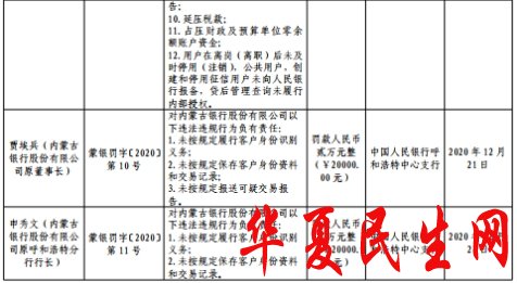 行政处罚决定书(蒙银罚字〔2020〕第11号)显示,申秀文(内蒙古银行原呼和浩特分行行长)对内蒙古银行以下违法违规行为负有责任:1.未按规定履行客户身份识别义务;2.未按规定保存客户身份资料和交易记录。