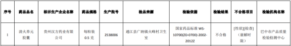 其中不符合规定药品名单第1项显示,标示为贵州汉方药业有限公司生产的、来源于通江县广纳镇火峰村卫生室的清火养元胶囊(药品规格:每粒装0.5克;生产批号:2538006)的检验结果不合格,不合格项目为[性状][检查](崩解时限)。检验依据为国家药品标准WS-10700(ZD-0700)-2002-2012Z;检验机构为巴中市产品质量检验检测中心。