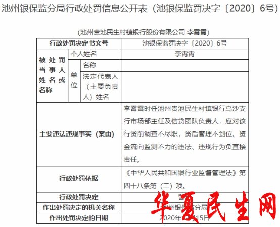 李霄霄时任池州贵池民生村镇银行乌沙支行市场部主任及信贷团队负责人,应对该行贷前调查不尽职,贷后管理不到位、资金流向监测不力的违法、违规行为负直接责任。依据《中华人民共和国银行业监督管理法》第四十八条第(二)项,池州银保监分局对其警告。