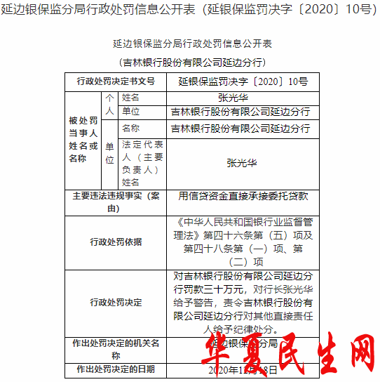 中国经济网北京12月23日讯 银保监会网站昨日公布的延边银保监分局行政处罚信息公开表(延银保监罚决字〔2020〕10号)显示,吉林银行股份有限公司(以下简称“吉林银行”)延边分行存在用信贷资金直接承接委托贷款的违法违规行为,行长张光华为相关责任人。