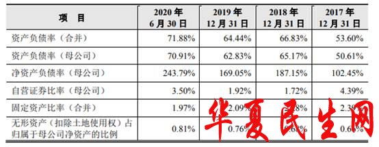 截至2016年末、2017年末、2018年末、2019年末和2020年6月末,财达证券的合并口径资产负债率分别为60.09%、53.60%、66.83%、64.44%和71.88%,母公司口径资产负债率分别为53.62%、50.61%、65.17%、62.83%和70.91%。
