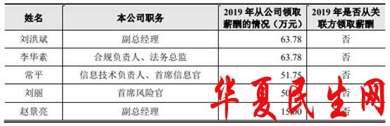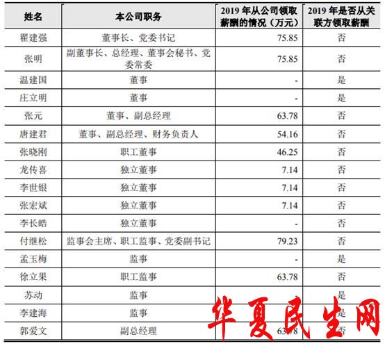 招股书中披露了具体管理人员2019年的薪酬情况,董事长、党委书记翟建强和副董事长、总经理、董事会秘书张明的年薪均为75.85万元,监事会主席、职工监事、党委副书记付继松的年薪为79.23万元。公司副总经理张元、职工监事徐立果、副总经理郭爱文、副总经理刘洪斌、法务总监李华素的年薪均为63.78万元。