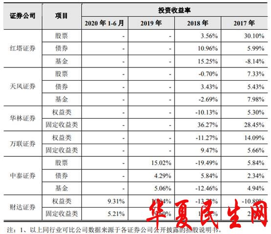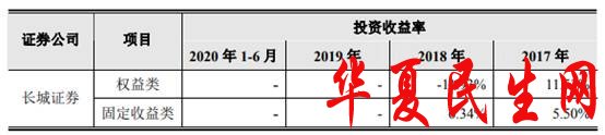 招股书披露,2016年、2017年、2018年、2019年和2020年1-6月,财达证券权益类自营业务的投资收益率分别为为-12.72%、-10.89%、-13.73%、10.84%和9.31%,固定收益类自营业务的投资收益率分别为9.28%、2.82%、11.42%、9.60%和5.21%。