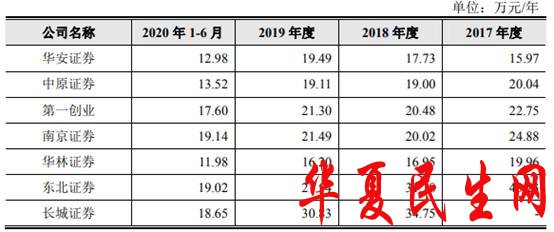2017年至2020年上半年,财达证券员工整体人均薪酬分别为19.20万元、18.71万元、19.58万元和11.62万元,可比公司人均薪酬分别为26.14万元、24.11万元、23.49万元和16.42万元。