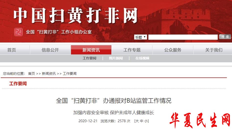2020年以来,全国“扫黄打非”办公室举报中心共接到群众反映B站问题的线索逾五百条。按照转办线索,上海市相关部门对B站行政立案处罚6次,约谈10余次。近期,针对B站平台存在的某些内容涉色情低俗等较突出问题,全国“扫黄打非”办公室再次部署上海市“扫黄打非”办组织查处。12月3日,上海市“扫黄打非”办联合市委网信办、市文旅局对B站进行约谈,责令其限期整改2周,全面排查违法违规和不良信息,加强视频、直播内容、漫画、图文及相关弹幕和跟评的审核;同时明确要求,在验收网站整改工作合格前,暂停具有舆论属性或社会动员能力的新业务新功能的内测或上线。