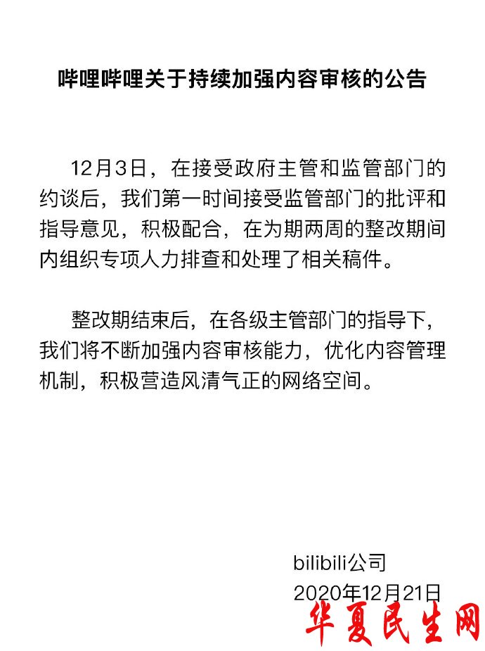 在公告中,哔哩哔哩表示:“12月3日,在接受政府主管和监管部门的约谈后,我们第一时间接受监管部门的批评和指导意见,积极配合,在为期两周的整改期间内组织专项人力排查和处理了相关稿件。整改期结束后,在各级主管部门的指导下,我们将不断加强内容审核能力,优化内容管理机制,积极营造风清气正的网络空间。”