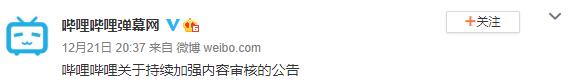 B站官方微博账号“哔哩哔哩弹幕网”昨日晚间发布了关于持续加强内容审核的公告。