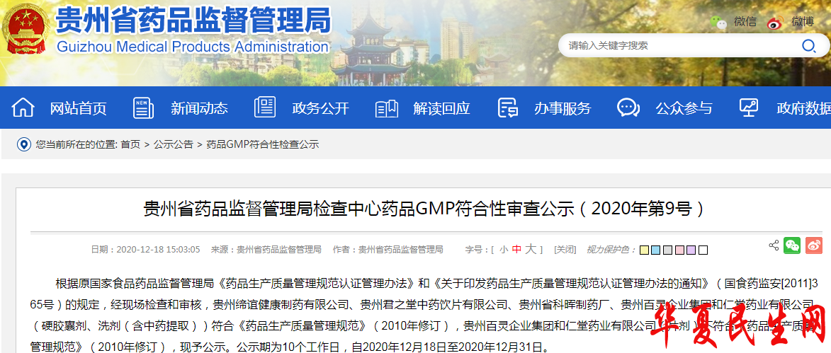 本次检查发现,贵州百灵企业集团和仁堂药业有限公司(片剂)不符合《药品生产质量管理规范》(2010年修订),现予公示。公示期为10个工作日,自2020年12月18日至2020年12月31日。