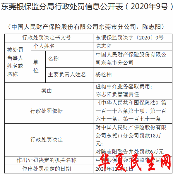 中国银保监会东莞监管分局依据《中华人民共和国保险法》第一百一十六条第十项、第一百六十一条、第一百七十一条规定,对中国人民财产保险股份有限公司东莞市分公司罚款18万元;对陈志阳警告并处罚款6万元。