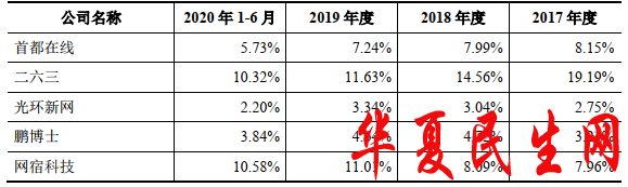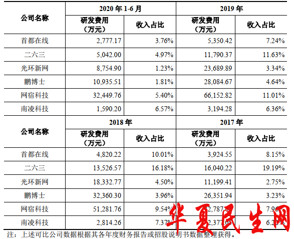 南凌科技研发费用在同行业可比上市公司中倒数第一。2019年、2020年1-6月,南凌科技与同行业可比上市公司网宿科技的研发费用均相差20倍。