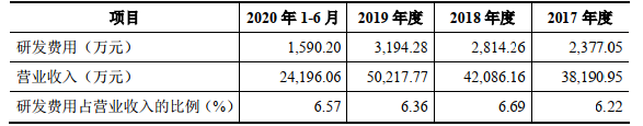 2017年至2020年1-6月,南凌科技研发费用分别为2377.05万元、2814.26万元、3194.28万元、1590.20万元,占同期营业收入比重分别为6.22%、6.69%、6.36%、6.57%。