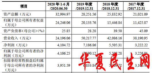 2017年至2020年1-6月,南凌科技实现营业收入分别为3.82亿元、4.21亿元、5.02亿元、2.42亿元;实现归属于母公司股东的净利润分别为3226.01万元、5508.28万元、7190.12万元、4106.25万元;实现扣除非经常性损益后归属于母公司股东的净利润分别为3106.41万元、5309.72万元、6833.84万元、3951.59万元。