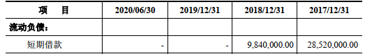 上述同期,南凌科技负债合计分别为9590.53万元、1.04亿元、8119.33万元、8751.99万元,其中短期借款在2017年、2018年分别为2852.00万元、984.00万元。