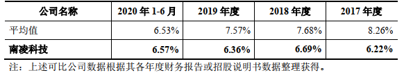 南凌科技毛利率与同行公司毛利率整体趋势相反。2017年至2020年1-6月,同行公司毛利率均值连降三年一期,而南凌科技毛利率2018年、2020年1-6月逆势上升。