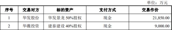 该公告显示,公司拟以支付现金的方式购买华发股份持有的华发景龙50%股权,购买华薇投资持有的建泰建设40%股权。本次交易华发景龙50%价格为2.19亿元,建泰建设40%股权交易价格为标的资产的交易价格为9000.00万元,总体交易对价为3.09亿元。本次交易构成关联交易、重大资产重组,不构成重组上市。本次事项独立财务顾问为中信证券股份有限公司,会计师事务所为大华会计师事务所(特殊普通合伙)。
