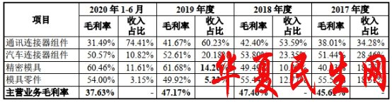 2017年至2020年1-6月,鼎通科技综合毛利率分别为44.54%、43.39%、43.75%、36.39%;其中,主营业务毛利率分别为45.61%、47.46%、47.17%、37.63%。