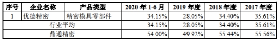上述同期,鼎通科技模具零件毛利率分别为55.56%、55.44%、49.92%、54.00%;同行业可比上市公司优德精密精密模具零部件产品毛利率分别为35.61%、34.40%、28.05%、34.15%。