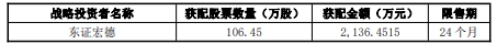 参与本次战略配售的战略投资者为保荐机构相关投资子公司东莞市东证宏德投资有限公司(以下简称“东证宏德”),战略配售数量为106.45万股,获配金额为2136.45万元,限售期为24个月。