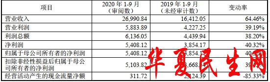 2020年1-9月,鼎通科技实现营业收入2.70亿元,同比增加64.46%;归属于母公司股东的净利润5408.12万元,同比增加40.32%;扣除非经常性损益后归属于母公司所有者的净利润5103.82万元,同比增加39.12%;经营活动产生的现金流量净额311.72万元,同比下降85.33%。