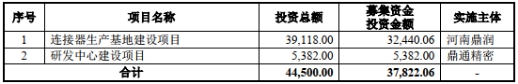 鼎通科技本次于上交所科创板上市,发行数量为2129万股,发行价格为20.07元/股,保荐机构为东莞证券股份有限公司,保荐代表人为袁炜、章启龙。鼎通科技本次募集资金总额为4.27亿元,扣除发行费用后,募集资金净额为3.78亿元。其中,3.24亿元用于连接器生产基地建设项目,5382.00万元用于研发中心建设项目。