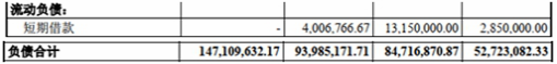 上述同期,鼎通科技负债合计分别为5272.31万元、8471.69万元、9398.52万元、1.47亿元。其中,短期借款在2017年至2019年分别为285.00万元、1315.00万元、400.68万元。