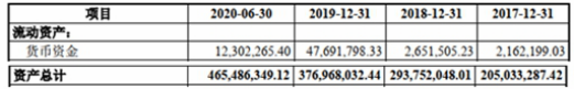 2017年末至2020年6月末,鼎通科技资产总计分别为2.05亿元、2.94亿元、3.77亿元、4.65亿元,其中货币资金分别为216.22万元、265.15万元、4769.18万元、1230.23万元。