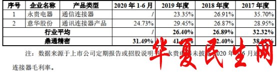 2017年至2020年1-6月,鼎通科技通讯连接器组件毛利率分别为38.01%、42.40%、41.67%、31.49%;2017年-2019年,行业均值分别为32.32%、26.89%、26.40%。其中,永贵电器2017年-2019年通信连接器产品毛利率分别为35.70%、26.91%、23.35%;意华股份2017年至2020年1-6月通讯连接器产品毛利率分别为28.95%、26.87%、29.45%、24.73%。