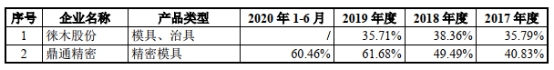 同期,鼎通科技精密模具毛利率分别为40.83%、49.49%、61.68%、60.46%;同行业可比上市公司徕木股份模具、治具产品毛利率分别为35.79%、38.36%、35.71%。