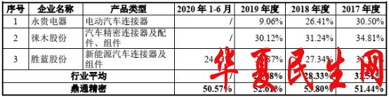 2017年至2020年1-6月,鼎通科技汽车连接器组件毛利率分别为51.44%、53.80%、52.61%、50.57%;2017年-2019年,行业均值分别为32.51%、28.33%、20.68%,其中,永贵电器2017年-2019年电动汽车连接器产品毛利率分别为30.50%、26.41%、9.06%,徕木股份2017年-2019年汽车精密连接器及配件、组件产品毛利率分别为34.81%、31.24%、30.12%,胜蓝股份2017年至2020年1-6月新能源汽车连接器及组件产品毛利率分别为32.21%、27.34%、22.87%、24.73%。