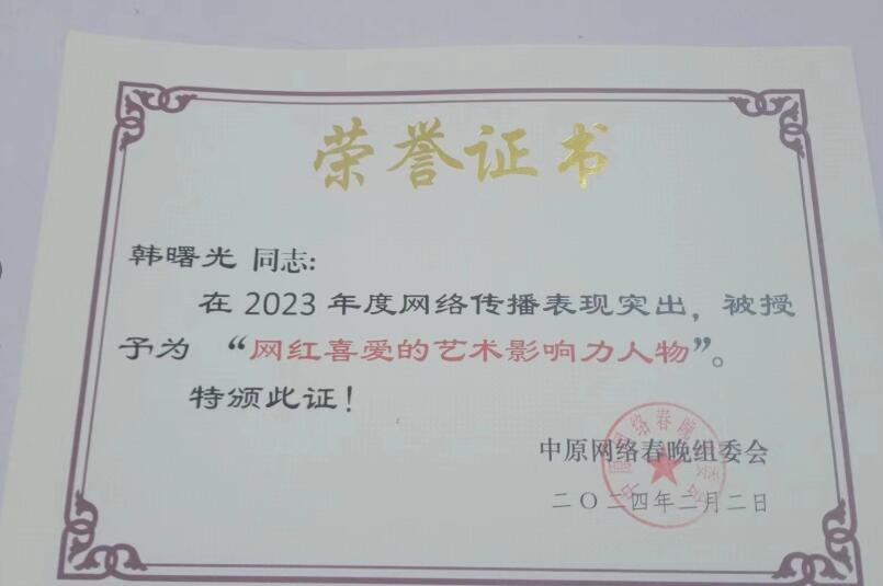 此次紫气东来”2024第六届中原网络春晚上,韩曙光先生由于在2023年度网络传播表现突出,被授予为 “网红喜爱的艺术影响力人物”
