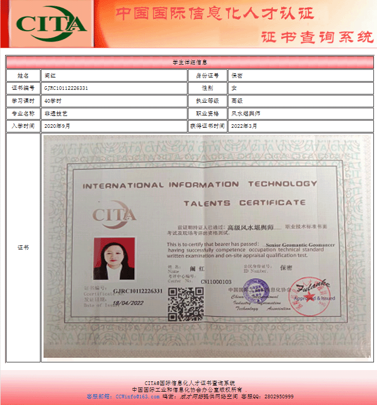 阚红: 满族, 现任中华周易联合会副会长。上海周易联合会副会长,易道名苑金牌讲师  心理疗愈师,情绪疗愈师,艺术指导师,国际认证魔法导师,国际认证塔罗导师,色彩能量疗愈师。近日她获得中国国际工业信息化协会人才认证办公室高级风水堪舆师专业技能资格认证证书。