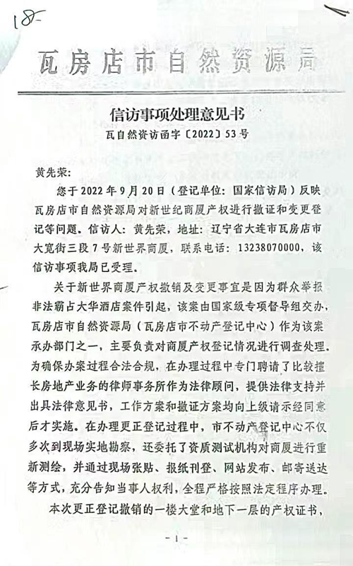 十几年来形成的产权事实,怎么到现在忽然就给撤销更改了呢?现在的几位产权人当然要向自然资源局发问。可他们最先的回答是,更改的原因是依据中央督导组关于大连涉黑案文件,是省长亲自签字的。调查中记者得知,针对这种说法,几位产权人与资源局叫起真儿来,非得让这个政府部门说出个涉黑的一二三来。于是,这自然资源局又改口了,不再说涉黑,而只说因群众举报,是国家级专项督导组交办。对此,新世界商厦的业主及产权人是不相信的,国家级督导组不会交办他们胡乱更改,他们认为,连介入的理由都能随意编造一个,其它的话还能相信吗?这个更改内中隐情太多。