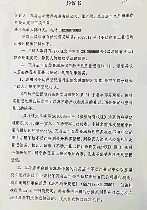 新世界商厦一楼是整体商厦的不可缺少部分。原商厦一层有5个大门进出商厦,其他4个门厅被间壁成门店,办了产权证,只有3号门厅是商厦唯一的上楼面积。瓦房店自然资源局,就选择把这个门厅作为全楼的公共面积废除产权证,其它4个门厅不动。这样做就是要毁掉这个商厦,让这个商厦无法运行下去。于润莲曾故意囤积雨水淹商厦,逼业户没法经营退出。