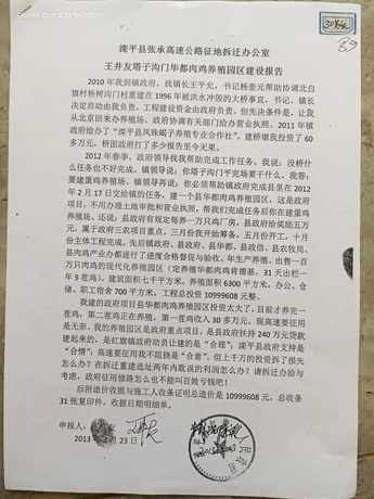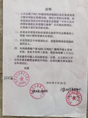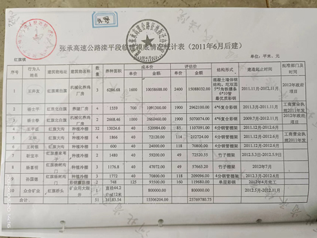 我拿到合法判决,县里还是拒绝给予赔偿补救。无奈到上级有关部门求救多次,政府受不了压力,找我家做工作叫二次起诉。我家不肯,说一个老百姓打不过你们县政府,县政府承诺给出示“张承高速公路征用拆迁补偿标准”相关证明我家再到法院起诉。也就有了县政府操办的2016年9月26日县政府、镇政府、村委会三级政府证明四项补偿事实,外加加盖县拆迁办公室公章的2013年4月6日统计表,该表显示我家纯养殖建筑面积是6286.68平方米(同原始评估养殖米数一致),评估单价2400元,评估金额15088032元的复制件一并送到我家,我家开始起诉的。