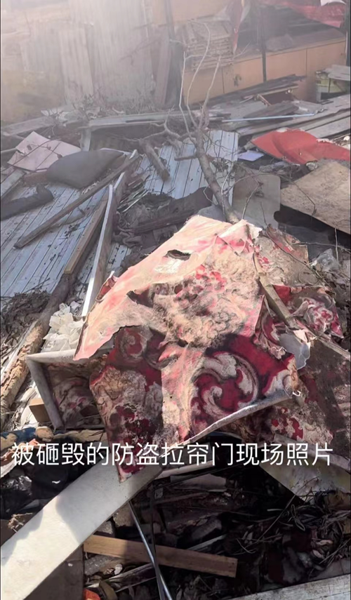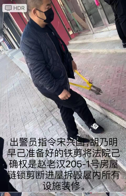 赵老汉说,被他锁好已经被法院确权是自己的房屋,于去年11月13号突然被宋兴国、胡乃明集结的六名不明身份人员,带着做案工具把205-1号三个门脸电动拉帘防盗门及消防头砸毁剪断,闯进屋内扔出屋内所有财物,砸毁房屋的全部装修和设施,理由却是,公安局决定此房屋贷款未还。已与沙河口区法院执行局沟通拍卖给宋兴国,与宋丽丽无关。赵老知道这又是谎言,此时法院已确权给了他,根本就没有拍卖,拍卖了他也应该知道。