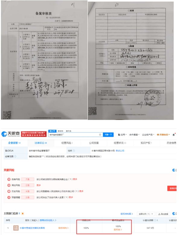 吉储橡胶厂营业执照在2005年10月17日因为没年检就已经被工商部门吊销,吉林省市场监督管理厅明知道不能做任何变更业务,但是还是采用“备案”程序,进行了出资人变更登记。