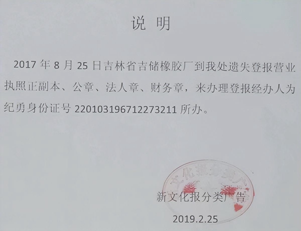 图为宽城区发改局副局长纪勇到新文化报社挂失企业执照公章的证据