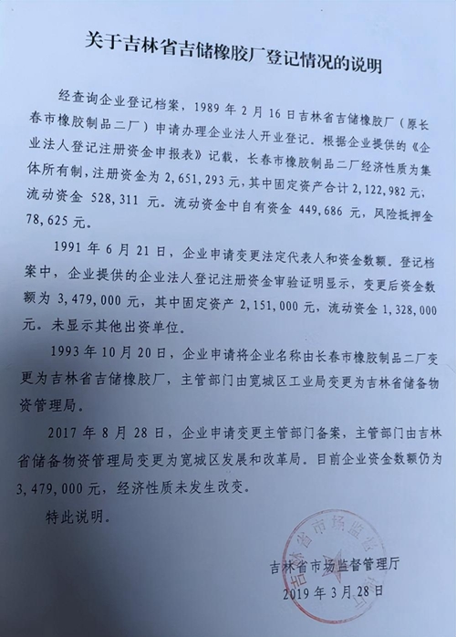在橡胶厂在职职工的强烈要求下,吉林省市场监督管理厅终于出来说话了:2019年3月29日,吉林省市场监督管理厅出具的《关于吉林省吉储橡胶厂登记情况的说明》中第二段显示:1991年6月21日,企业申请变更法定代表人和资金数额,登记档案中企业提供的企业法人登记注册资金审验证明显示,变更后资金数额为3,479,000元,其中固定资产2,151,000元,流动资金1,328,00元,未显示其他出资单位。”