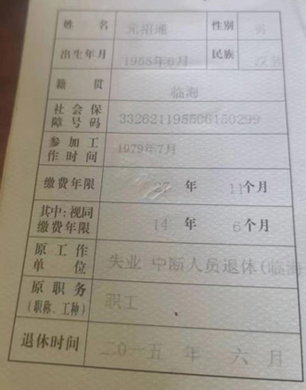 我叫元某通,男,今年69岁,浙江临海人。在1979年,本人用正现手续,通过劳动局进入临海铸造机械厂接老人班工作,在1993年4月1日签订直至退休的劳动合同。该企业无视《劳动法》等相关法律法规的规定,到1995年无故剥夺了员工的劳动权利,还中断了缴纳社保的法定义务,造成本人法定退休视同缴费年限。