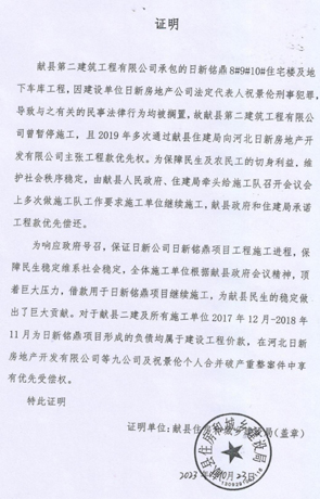 2020年5月21日,献县日新铭鼎2#、3#楼,按照县里安排部署和日新房地产项目工作领导小组要求,献县住建局组织施工单位、监理单位及相关科室在献县建筑工程有限责任公司召开了日新项目复工协调会议,并于 2020年5月24日组织施工单位、监理单位及相关科室对项目进行了核查,并提出了复工要求。经日新房地产项目工作领导小组研究,决定日新铭鼎2#、3#楼开始办理工程延期相关手续,并要求施工单位组织人员进场准备复工(有住建局下发的文件)。
