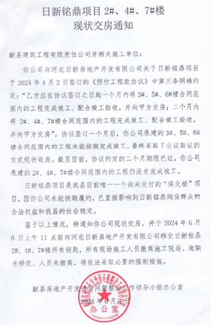 6月4日,由献县房地产开发遗留问题整治工作领导小组办公室下发了一份《日新铭鼎项目2#、4#、7#楼现状交房通知》,通知我单位必须于6月6日上午11点前向河北日新房地产开发有限公司移交所有钥匙。如果到时不交,人员未撤离,将采取必要的强制措施。自我方申报债权以来,始终未予以确认,关于工程价款鉴定(6#、7#楼按照我方做的预算,现欠我方约1600万元,2#、3#楼约2310万元。此款中不含违约金和赔偿),至今没有出具,政府还强行逼迫我施工单位交房,还为重整投资人做后盾。