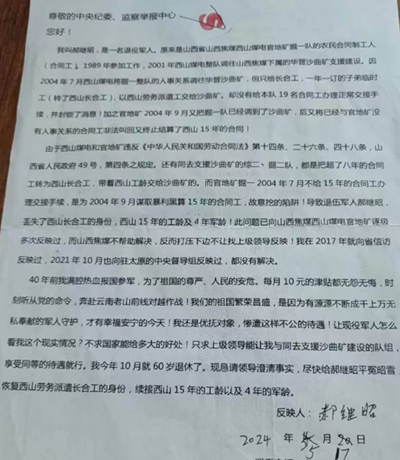 近日,原山西焦煤西山煤电官地矿职工郝某昭致函有关部门,反映西山煤电挖陷阱坑丢其西山长合及15年工龄、4年军龄等问题。恳请上级领导予以高度重视,尽快查明事实真相,依法依规公正处理。