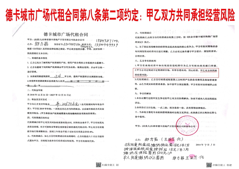 德卡公司介绍:德卡公司投资2个多亿建设的城市广场项目,位于扶余市火车站前,是扶余地标性建筑,商场建筑面积约58511.53平方米,公司自持约70%,一至四层共销售377户,一三四层出售的265个商铺没有代租,仅二层的112户代租,112个商铺的总面积2300平方米,不到总建筑面积的5%。他们购买单个商铺使用面积5至10平方米不等,单独对外出租无法使用,所以让我公司为其代租。2020年突发新冠疫情,对以人群聚集为基础的大型综合商场影响极其严重。为了共度难关,根据代租合同第八条“甲乙双方共同承担经营风险”的约定,德卡公司曾多次找二层业户对代租价格进行协商,他们把代租租金价格降一些,公司赔一些,共同度过疫情难关,可是二层业户坚决要求按照代租合同执行。无奈之下,商场于2021年5月16日被迫关停营业至今,至此《代租合同》实际已经无法履行,这使双方签订的案涉合同的履行陷于僵局,最终诉至法院。