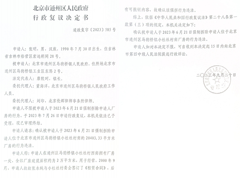 2023年9月20日,通州区人民政府针对马驹桥政府违法暴力拆迁行为作出复议决定,马驹桥人民政府强拆行为违法。