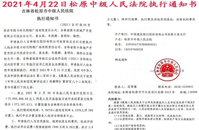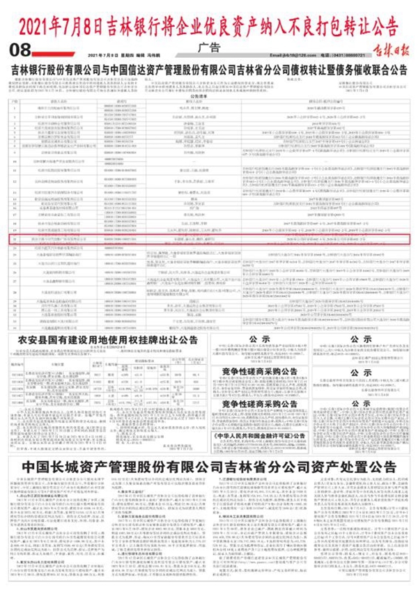 据介绍,就还款问题,德卡公司在多次向吉林银行打报告说明情况的同时,还曾经多次去吉林银行与其商量用扶余市政府的欠款顶账。万万没有想到的是,2021年4月22日,德卡公司突然收到松原市中级法院的执行裁定书(【2021】吉07执66号之一)和执行通知书(【2021】吉07执66号),法院查封了德卡公司用于抵押的房产。更令德卡感到震惊的是,7月8日,居然从吉林日报上看到了打包转让其抵押资产的公告!