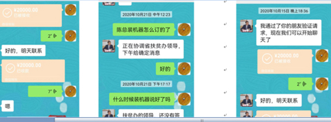 近日,笔者接到来自石家庄市的赵继安先生反映的一份材料,赵先生反映称;河北唐普农业科技有限公司陈某亮,在2020年10月15日以河北省扶贫办(现河北省乡村振兴局)有认识的领导关系,(省县乡村振兴局领导陈某国“帮忙”能在石家庄的大中学校投放自动售货机预计2000台)并以打点领导为名让他拿出2万元,事情不但没有办,钱却一直不给退。(有微信转账记录)后来又以河北扶贫开发投资有限公司名义,陆续骗他购买扶贫产品37158元,(其中给过一部分产品大约1.2万,)多次讨要以各种理由不退款。
