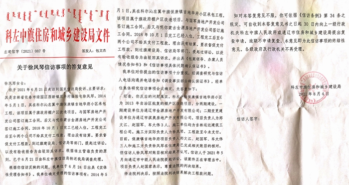 法院的判决没有等来,住建局的答复意见却来了。2021年8月4日,科左中旗住建局做出了《关于徐凤琴信访事项的答复意见》(左建信字【2021】087号)。
